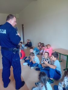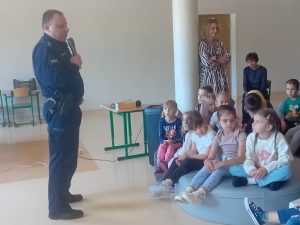👮‍♂️ Funkcjonariusz przestrzegał dzieci przed zabawami w pobliżu jezdni oraz omówił zagrożenia związane z kontaktami z nieznajomymi. Uczniowie dowiedzieli się, jak reagować w sytuacjach niebezpiecznych i jak unikać ryzykownych zachowań.