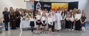 W przedstawieniu zaprezentowali się przede wszystkim uczniowie klas 7 oraz 1–3, którzy z ogromnym zaangażowaniem odegrali swoje role. Przedstawiciele klasy 4 wsparli szkolny chór, śpiewając ramię w ramię z koleżankami z klasy 7. 🎶 Choć tematyka wielkanocna bywa wymagająca, nasi uczniowie przekazali ją w sposób zrozumiały, poruszający i pełen wrażliwości. 💛