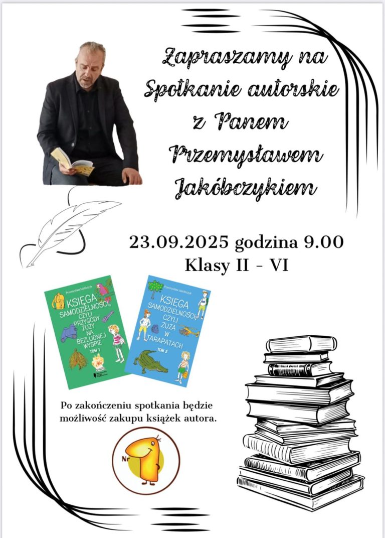 Serdecznie zapraszamy uczniów klas II-VI na spotkanie z pisarzem Przemysławem Jakóbczykiem. Odbędzie się ono 23 września br. o godz. 9:00 w naszej szkole. Będziecie mieli
