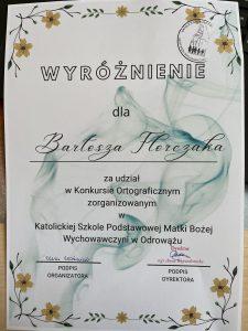 Wszystkim gratulujemy doskonałej znajomości polskiej ortografii, a szczególne wyrazy uznania składamy na ręce Bartosza Florczaka. który otrzymał wyróżnienie.