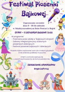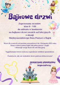 Międzynarodowy Dzień Postaci z Bajek Post author:Izabela Wojcierowska Post published:29 października 2025 Post category:Bez kategorii Międzynarodowy Dzień Postaci z Bajek już 5 listopada! Zapraszamy wszystkich uczniów do wspólnej, bajkowej zabawy w naszej szkole! Startujemy o godzinie 10:00, a w programie dla klas 0–III: Przemarsz przez szkołę w bajkowych strojach (przebranie obowiązkowe!) Zabawy integracyjne przy największych hitach muzyki z bajek Szkolny Festiwal Piosenek Bajkowych i Dziecięcych Piosenki można wykonać solo lub w małych grupach Mile widziane podkłady w formacie mp3 na pendrive Nie dopuszczamy filmików typu „rolka” Zapisy na festiwal do końca października u wychowawców klas Dla klas 0–VIII ogłaszamy konkurs na BAJKOWE DRZWI! Wybierzcie jedną bajkę lub postać i udekorujcie drzwi wejściowe do sali Termin: do 5 listopada Pamiętajcie, by nie uszkodzić drzwi podczas dekorowania Najpiękniejsze drzwi zostaną nagrodzone słodkim upominkiem dla całej klasy! Niech ten dzień będzie pełen uśmiechu, kolorów i bajkowej magii! Może ci się spodobać również Lektura w grze 18 marca 2025 Apel podsumowujący I semestr roku szkolnego 2022/2023 23 lutego 2023 Zabawy w Oddziale Przedszkolnym 22 czerwca 2025