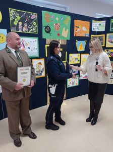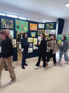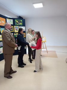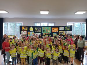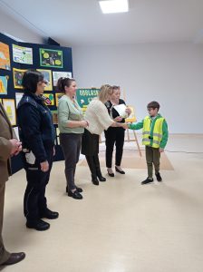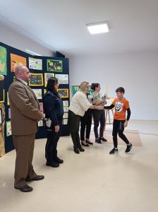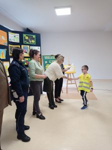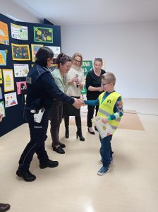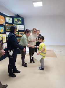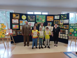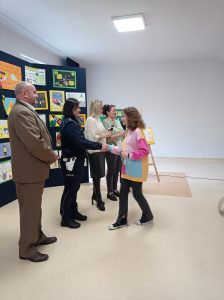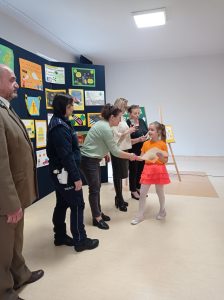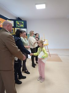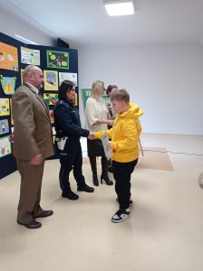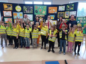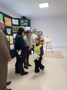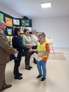 Pani Dyrektor oraz przedstawiciele Komendy Powiatowej Policji w Końskich i Nadleśnictwa Stąporków wręczyli uczniom dyplomy, nagrody oraz elementy odblaskowe  za udział w konkursach: plastycznym, literackim oraz konkursie wiedzy „Bezpieczeństwo w ruchu drogowym”.