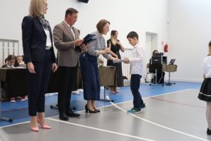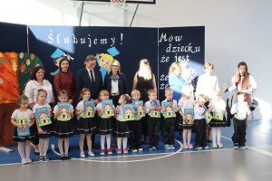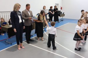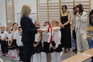 W tym ważnym dniu dzieciom towarzyszyli rodzice, dziadkowie, Pan Wicedyrektor Olaf Mieszalski, a także zaproszeni goście, którzy obdarzyli dzieci prezentami: Pan Burmistrz Jarosław Młodawski, Pani Dyrektor CUW Anna Świtakowska, Pani Radna Sylwia Stępień, Przedstawiciele Rady Rodziców – na czele z przewodniczącą Panią Joanną Jedynak.  Wszystkim dziękujemy za upominki i słodkości!