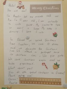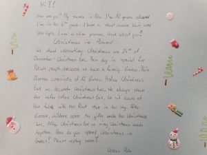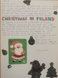 Uczniowie klasy 5a i 6, pod okiem koordynatora projektu Pani Anny Solarz, napisali listy w języku angielskim do swoich greckich kolegów i koleżanek, opowiadając o sobie, a także o polskich zwyczajach bożonarodzeniowych.