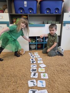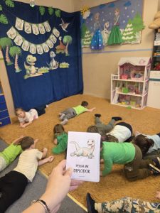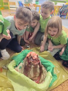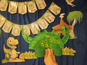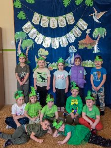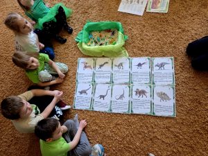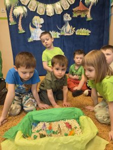 W trakcie zajęć przedszkolaki z ogromnym zainteresowaniem poznawały dinozaury – ich nazwy, wygląd i ciekawostki z życia sprzed milionów lat. Wykazały się przy tym zadziwiającą wiedzą dotyczacą tych fascynujących gadów oraz hipotez dotyczących ich wyginięcia.