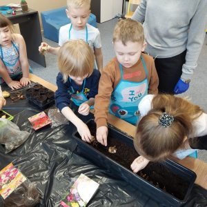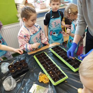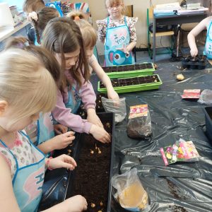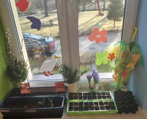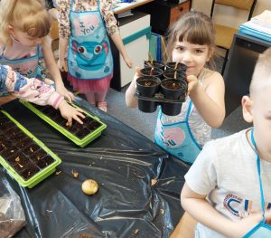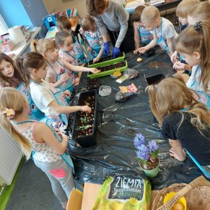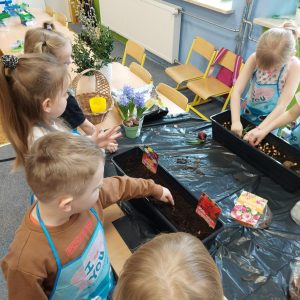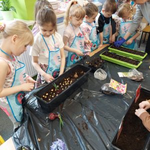 W oddziale przedszkolnym dzieci sadziły kwiaty cebulowe, dymkę na szczypiorek oraz zasiały różnego rodzaju nasionka. Dzięki bezpośredniej obserwacji przedszkolaki będą miały możliwość poznania cyklu rozwoju roślin. Z niecierpliwością czekamy na efekty naszej pracy ![]()